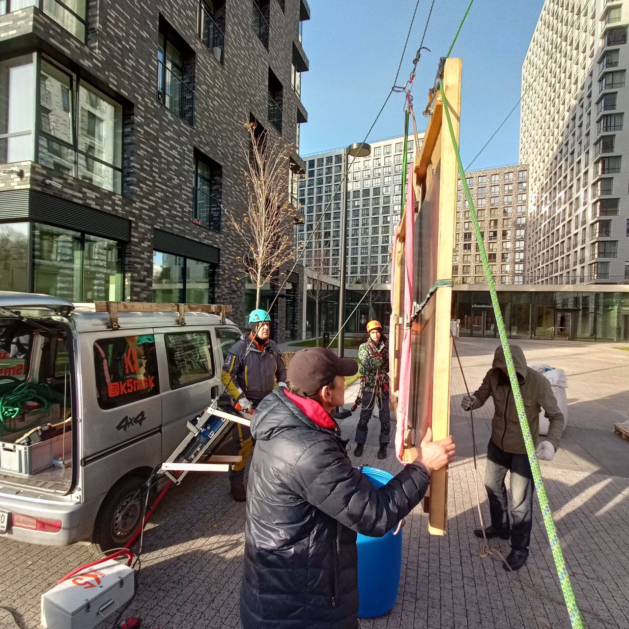 Команда промышленных альпинистов К5 успешно выполнила комплекс работ по подъёму и перемещению плит керамогранита для интерьерных решений в жилом комплексе «Кутузовский».